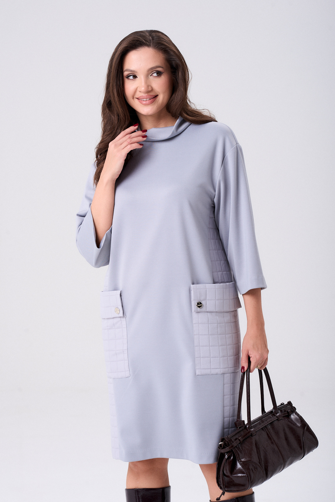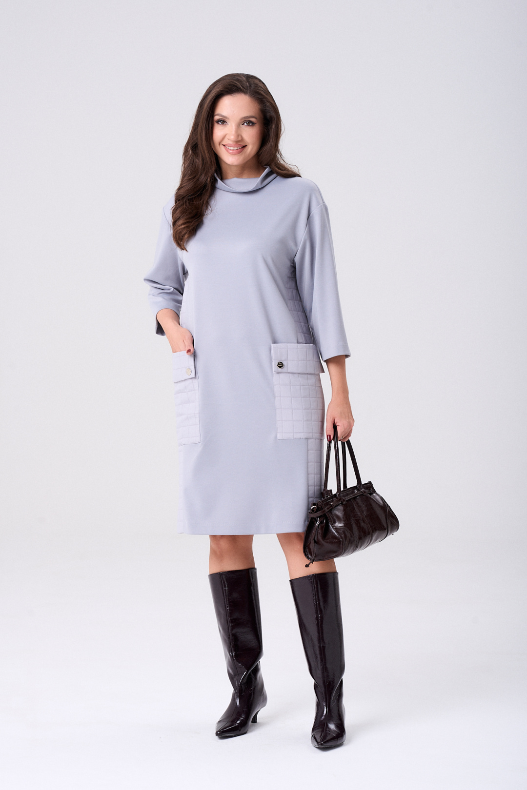 Платье прямого свободного силуэта выполнено из двух видов ткани: трикотажного полотна и жаккардовой ткани. Центральные части переда и спинки - трикотаж. Боковая часть платья - из отделочной ткани. Спереди большие накладные карманы с клапаном, который фиксируется пуговицей. Воротник-стойка. Линия плеча спущена. Рукав втачной, прямой.