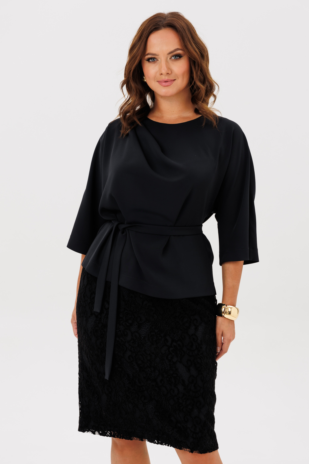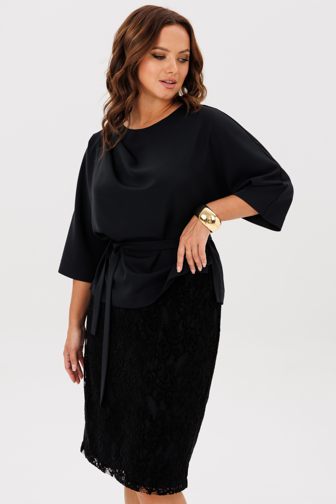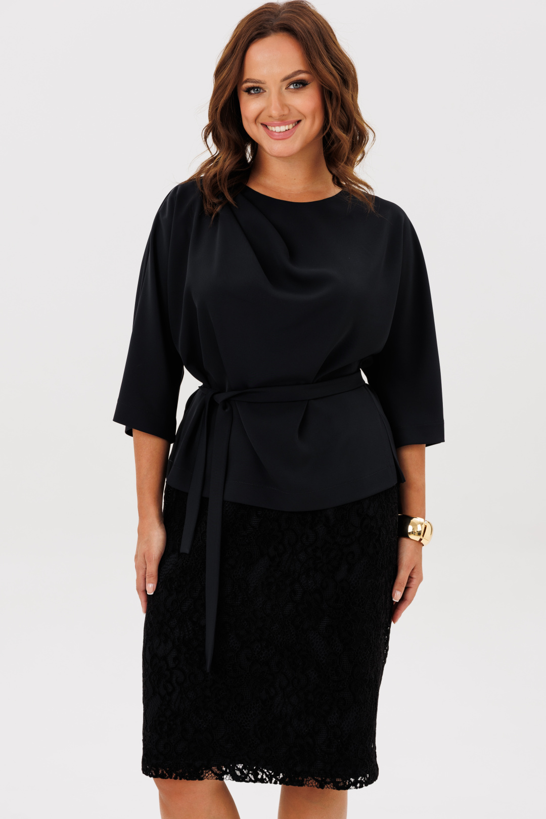 Комплект женский состоит из блузки и юбки. Блузка с цельнокроеным рукавом длиной 3/4. От правого плеча идут мягкие складки к центру переда. Застежка по центру спинки на петлю и пуговицу. По бокам небольшие разрезы. Блузка с поясом. Юбка на поясе выполнена из кружевного полотна на подкладке из основной ткани. На поясе по бокам эластичная тесьма. По среднему шву задней половинки юбки молния, снизу разрез 13,5 см.