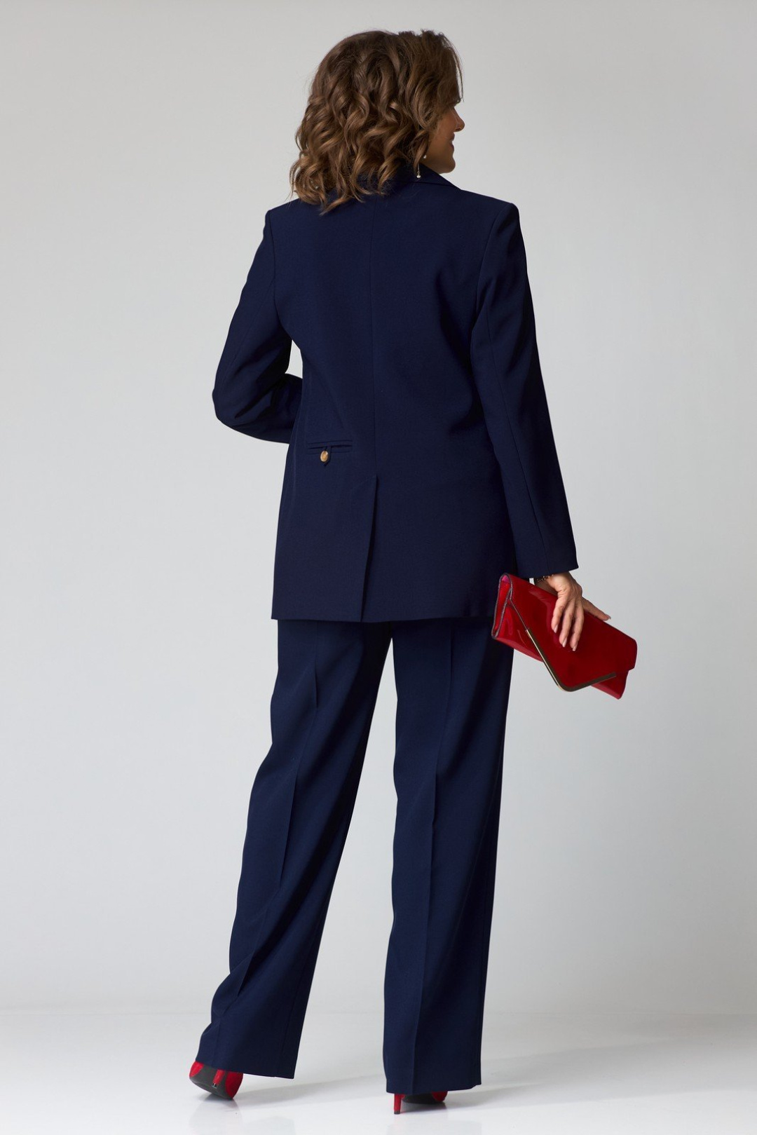 Жакет прямого силуэта, с застежкой на две петли и две пуговицы. Перед жакета с нагрудной вытачкой, идущей от бокового шва, с прорезными карманами в рамку с клапаном, левая сторона переда с настрочной листочкой выше груди. Спинка жакета со средним швом, заканчивающийся шлицей, левая часть спинки с прорезным карманом в рамку, вход в который фиксирует навесная петля с пуговицей. Длина жакета - до середины бедра. Рукава двухшовные втачные. Горловина оформлена воротником пиджачного типа. Жакет отлично будет смотреться как с формальными, так и с более повседневными комплектами одежды.