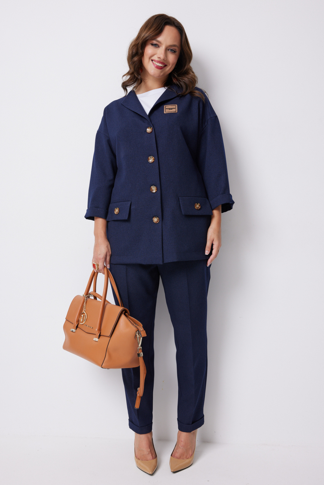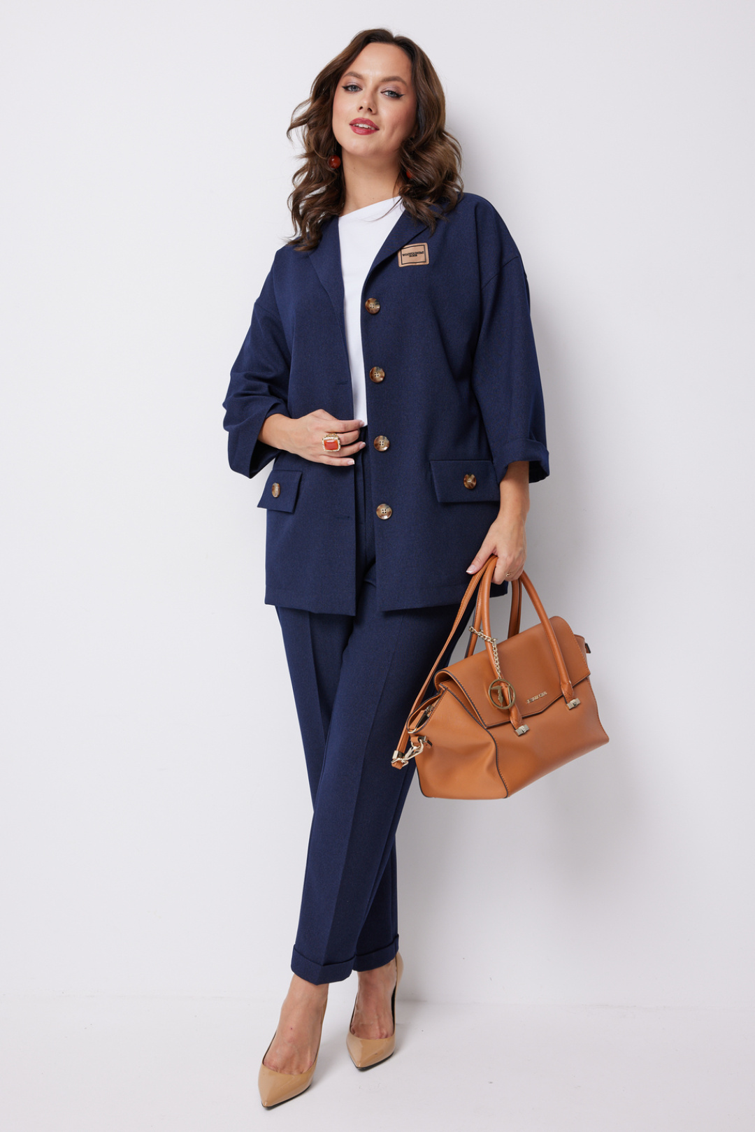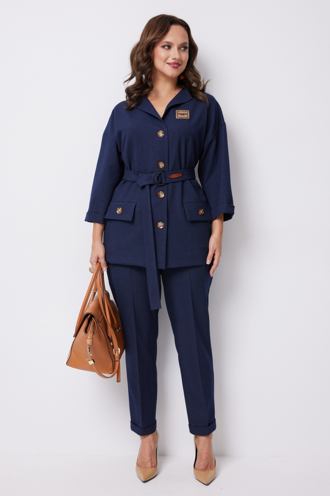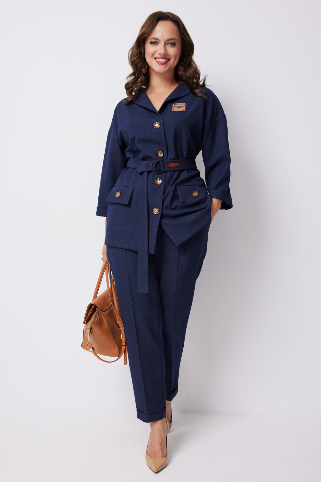 Костюм женский 2-х предметный, состоящий из жакета и брюк. Жакет выполнен из поливискозы, без подкладки. Жакет прямого силуэта, с цельнокроенным рукавом, с центральной застежкой на петли и пуговицы. Перед с нагрудными вытачками, в области груди - декоративная нашивка. По переду в области бедер обработаны прорезные карманы с листочками и клапанами, на которых пришиты декоративные пуговицы. Спинка со средним швом и талиевыми вытачками. Рукава одношовные, с цельнокроенными манжетами. В комплект входит съёмным пояс из основной ткани с Д-пряжкой и нашивкой. Брюки выполнены из полизивкозы, прямого силуэта со стрелками по передним и задним половинкам. Верхний срез обработан притачным поясом. По центру переда - застёжка на крючок и тесьму-молнию. В области боковых швов вставлена резинка. На задних половинках расположены талиевые вытачки. В боковых швах расположены наклонные карманы. Низ брюк с цельнокроенными манжетами.