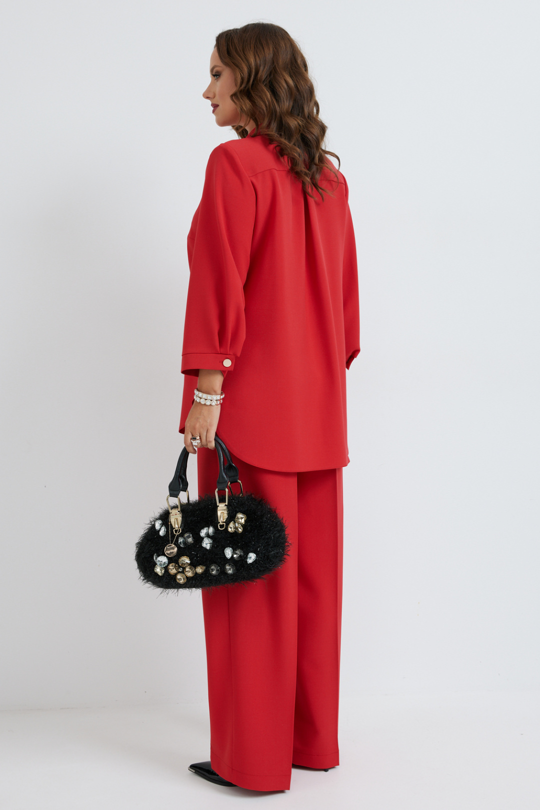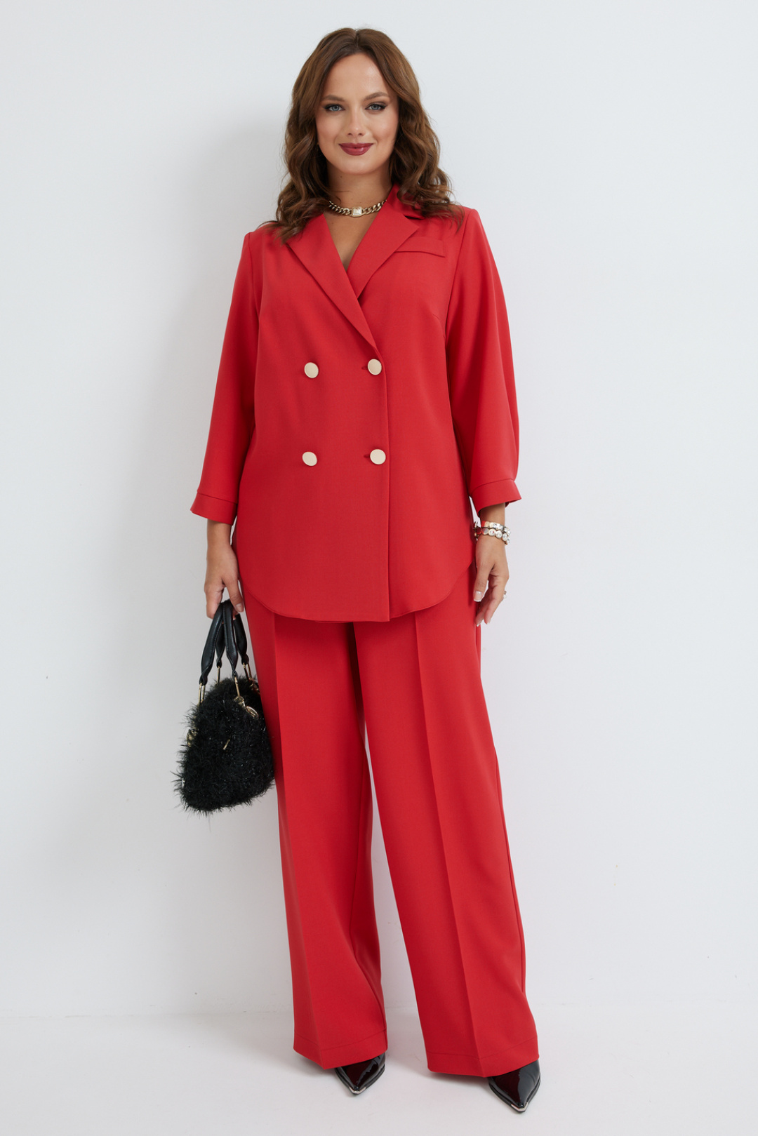 Костюм состоит из жакета и брюк. Качественная поливискоза, из которой выполнена модель, обеспечит долговечность изделию и приятные ощущения его обладательнице. Жакет без подкладки прямого силуэта, с двубортной застежкой на петли-пуговицы, длиной до середины бедра. Перед жакета с нагрудными вытачками, в области груди расположена декоративная листочка. Спинка с двойной кокеткой, в шве притачивания которой обработана встречная складка. Низ жакета фигурный, с закруглениями по боковым швам. Рукава двушовные, длиной 3/4, по низу с манжетой, застегивающейся на петлю и пуговицу. Горловина оформлена воротником пиджачного типа. Брюки классической формы, прямые от линии бедер, со стрелками по передним и задним половинкам. Верхний срез обработан поясом, в который от бокового шва вставлена резинка по задним половинкам. В боковых швах обработаны наклонные карманы. На задних половинках расположены талиевые вытачки. В комплект входит пояс из основной ткани.