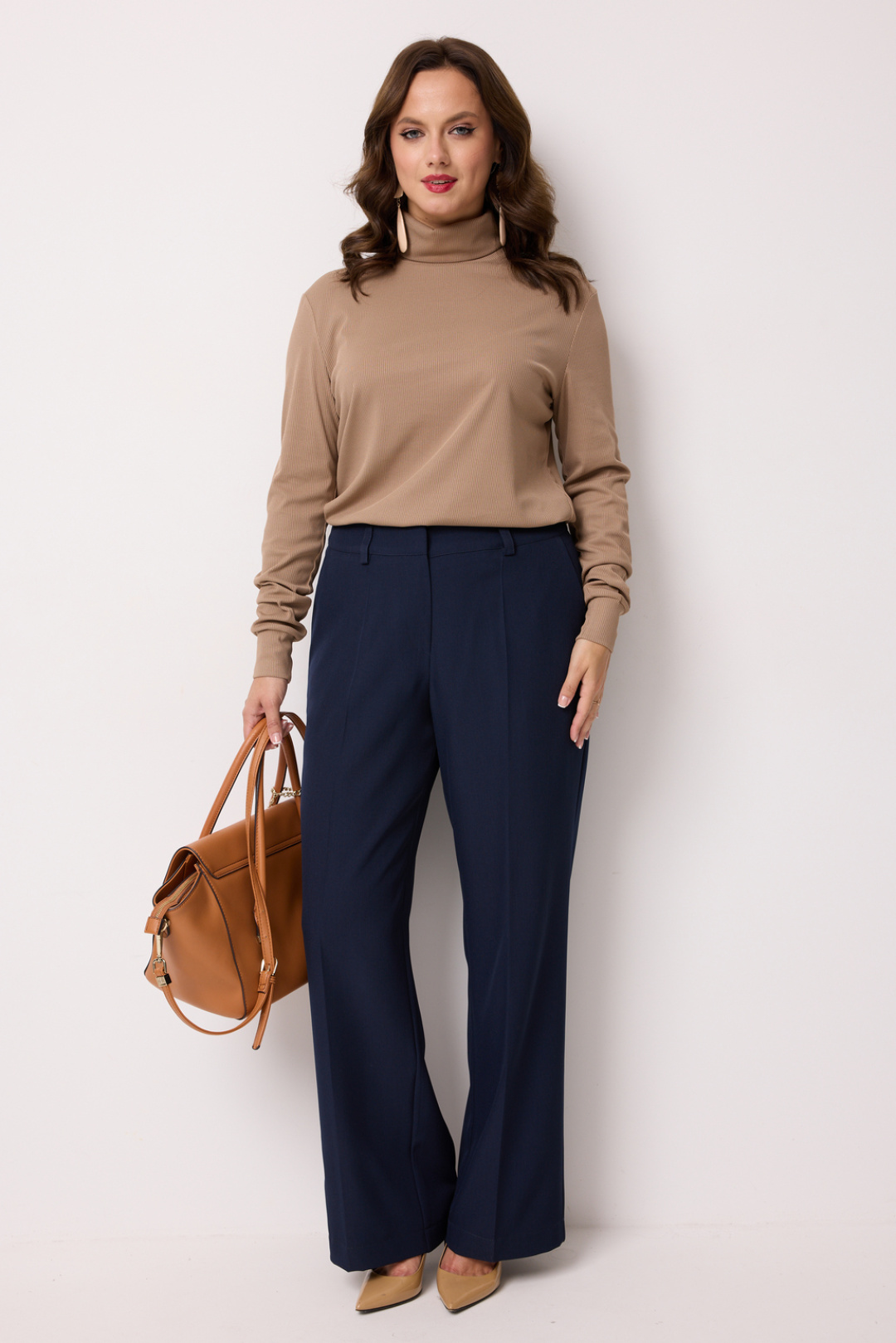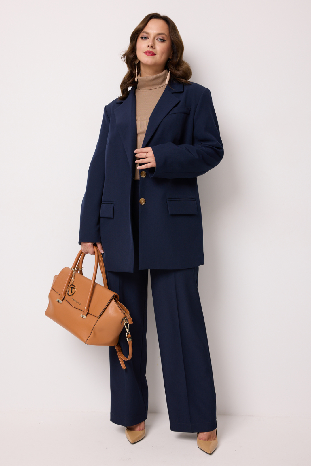 Элегантный костюм-тройка, состоящий из жакета, джемпера и брюк. Жакет и брюки выполнены из костюмной ткани, джемпер — из трикотажного полотна. Жакет прямого силуэта, с застежкой на две петли и две пуговицы. Перед жакета с нагрудной вытачкой, с прорезными карманами в рамку с клапаном. Спинка жакета со средним швом, заканчивающийся шлицей, левая часть спинки с прорезным карманом в рамку, вход в который фиксирует навесная петля с пуговицей. Рукава двухшовные втачные. Горловина оформлена воротником пиджачного типа. Джемпер прямого силуэта, выполнен из вискозы. Перед и спинка цельнокроенная. Рукав длинный. Горловина типа "водолазка". Длина изделия - середина бедра. Брюки классической формы, прямого силуэта, со стрелками по передним и задним половинкам. Верхний срез обработан обтачным поясом. На задних половинках расположены талиевые вытачки, с декоративными листочками. В боковых швах брюк - наклонные карманы. Застёжка центральная на тесьму молнию и крючок.