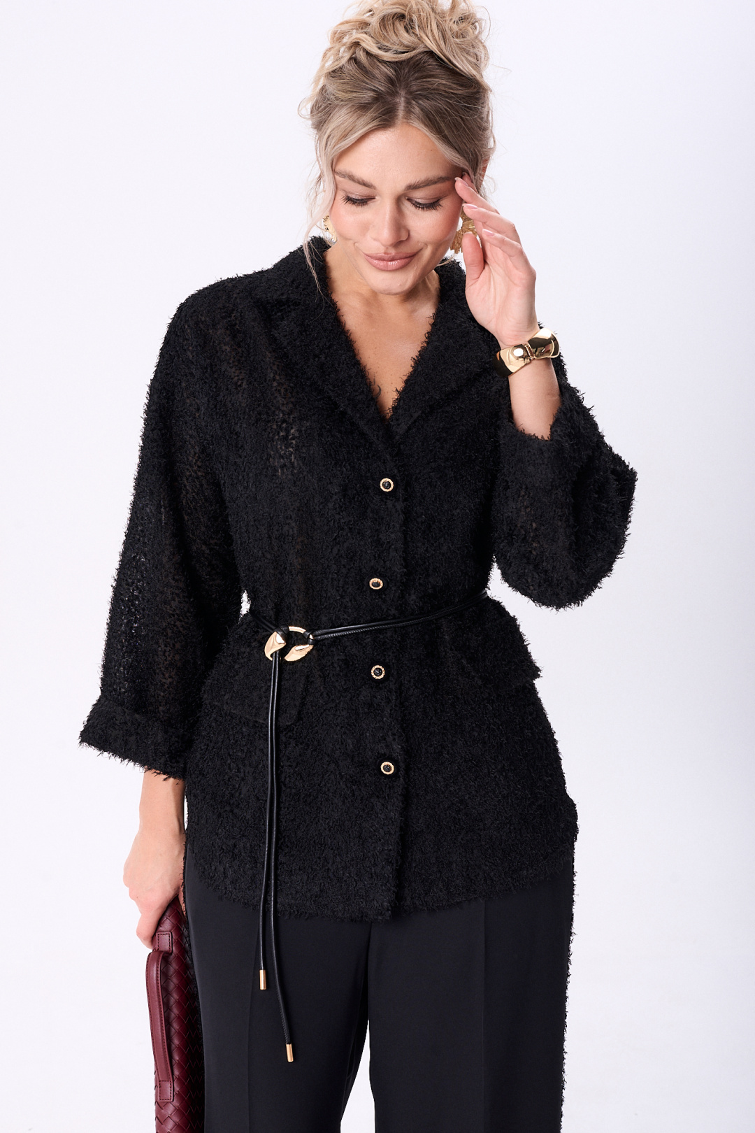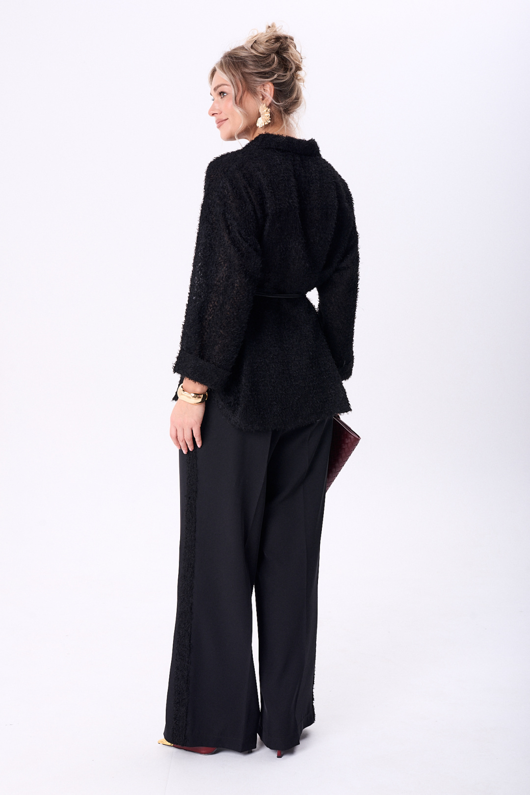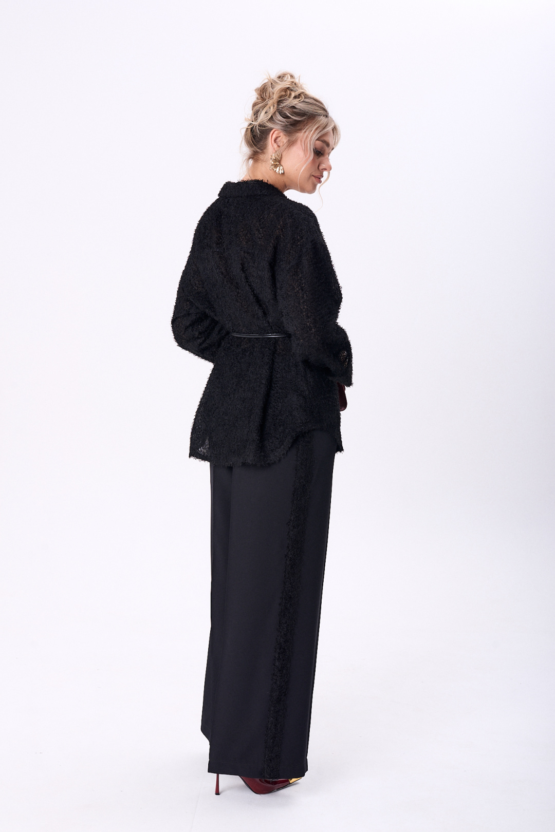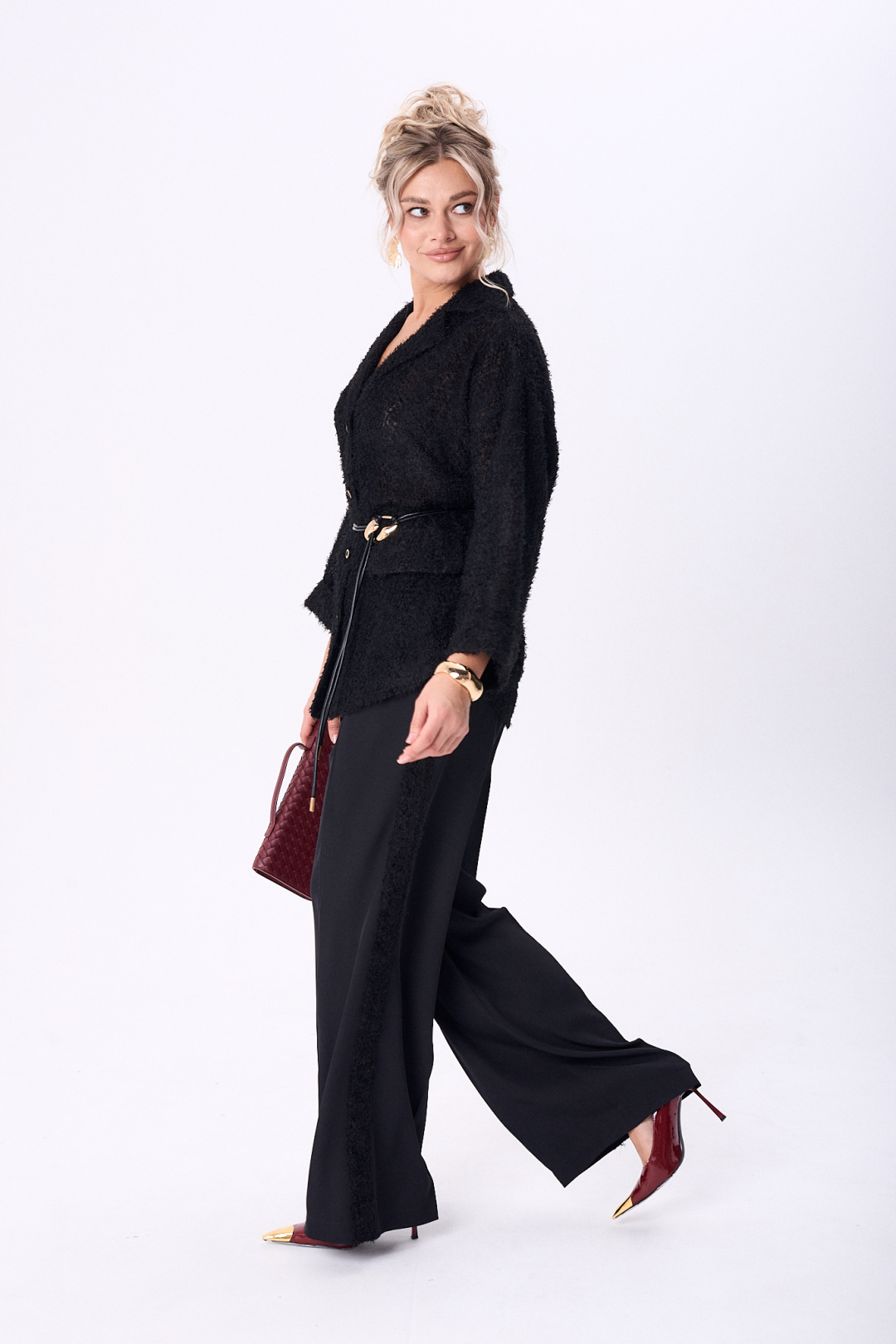 Комплект двойка состоит из жакета, и Брюк. Жакет свободного кроя.Рукав спущенный, свободного кроя с манжетой на пату. По переду застежка на петли пуговицы. По переду выполнены функциональные клапаны под пояс.