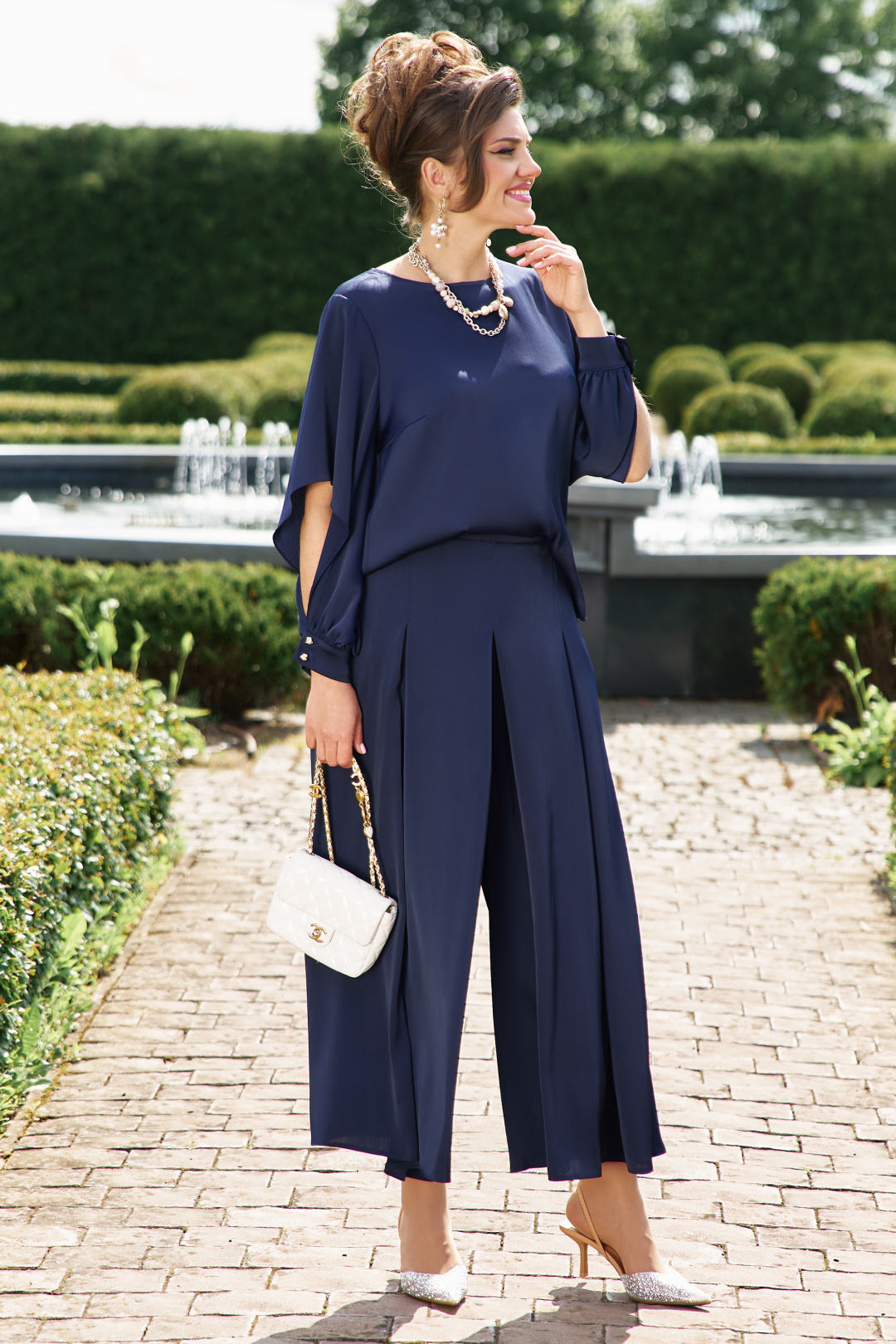 Брюки-кюлоты свободного силуэта, длиной 7/8 расширяются к низу. Пояс притачной со вставкой эластичной тесьмы-резинки, которая обеспечивает максимально удобную посадку на любой тип фигуры. По переду брюк от верха застрачиваются складки. В задней части брюк застёжка на тесьму-молнию в шве и пуговицу в поясе. В боковых швах брюк - карманы.