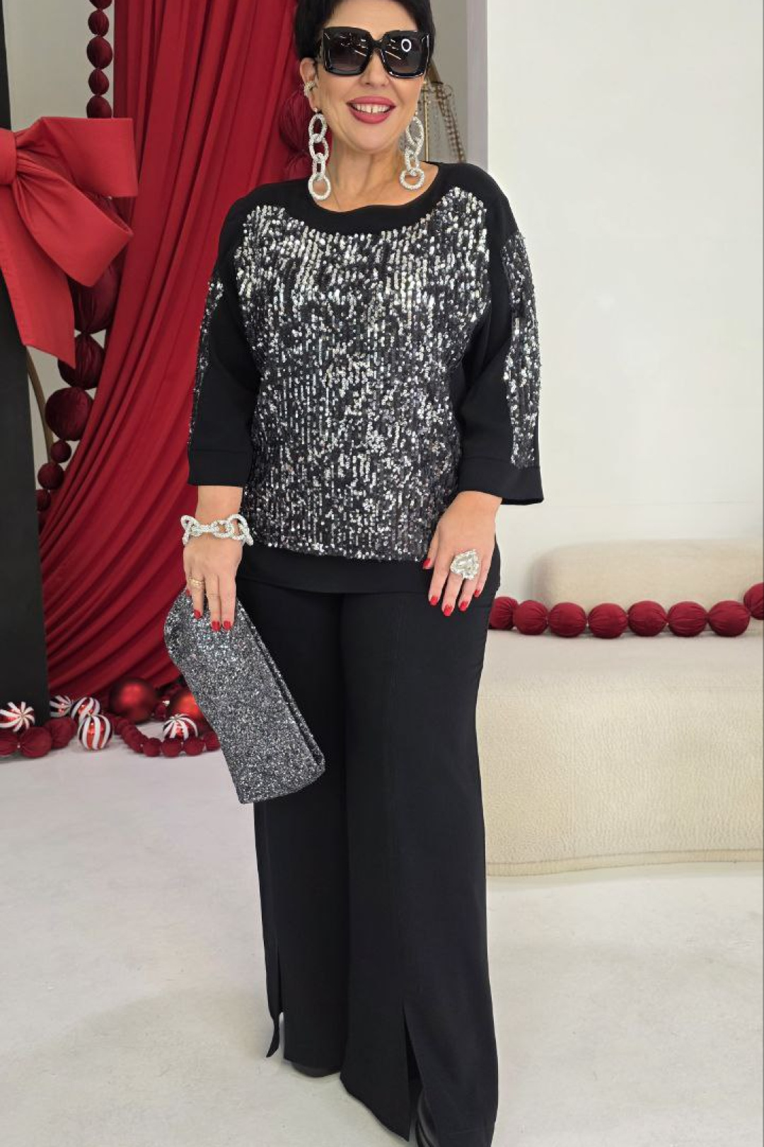 Комплект новогодний женский брючный, состоящий из блузы и брюк. Роскошный женский комплект, состоящий из полупрозрачной блузы с отделкой из ткани в пайетки и брюк - идеальный выбор для праздничного выхода! Блуза свободного силуэта, прямая к низу. Горловина в блузе округлой формы. С настрочной отделочной деталью по переду которая повторяет форму горловины. Спинка блузы без особенностей. Рукав в блузе трехшовный на центральную часть настрачивается отделочная ткань с пайетками по низу манжет. Низ прямой формы. Брюки прямого силуэта с притачным поясом с эластичной тесьмой резинкой, которая обеспечивает максимально удобную посадку на любой тип фигуры. В качестве дополнительного отделочного элемента брюк рельефная линия по переду в разутюжку с отделочными строчками. Длина блузы по спинке 64 см (р 52-56), 65 см (р 58-62). Длина рукава 44 см.
