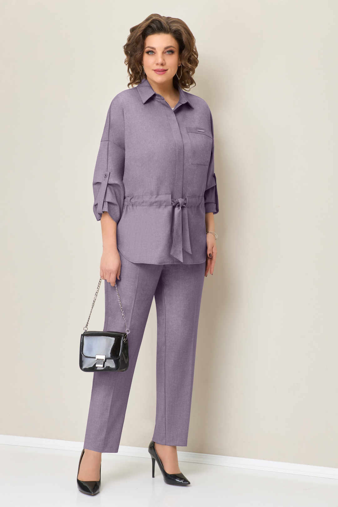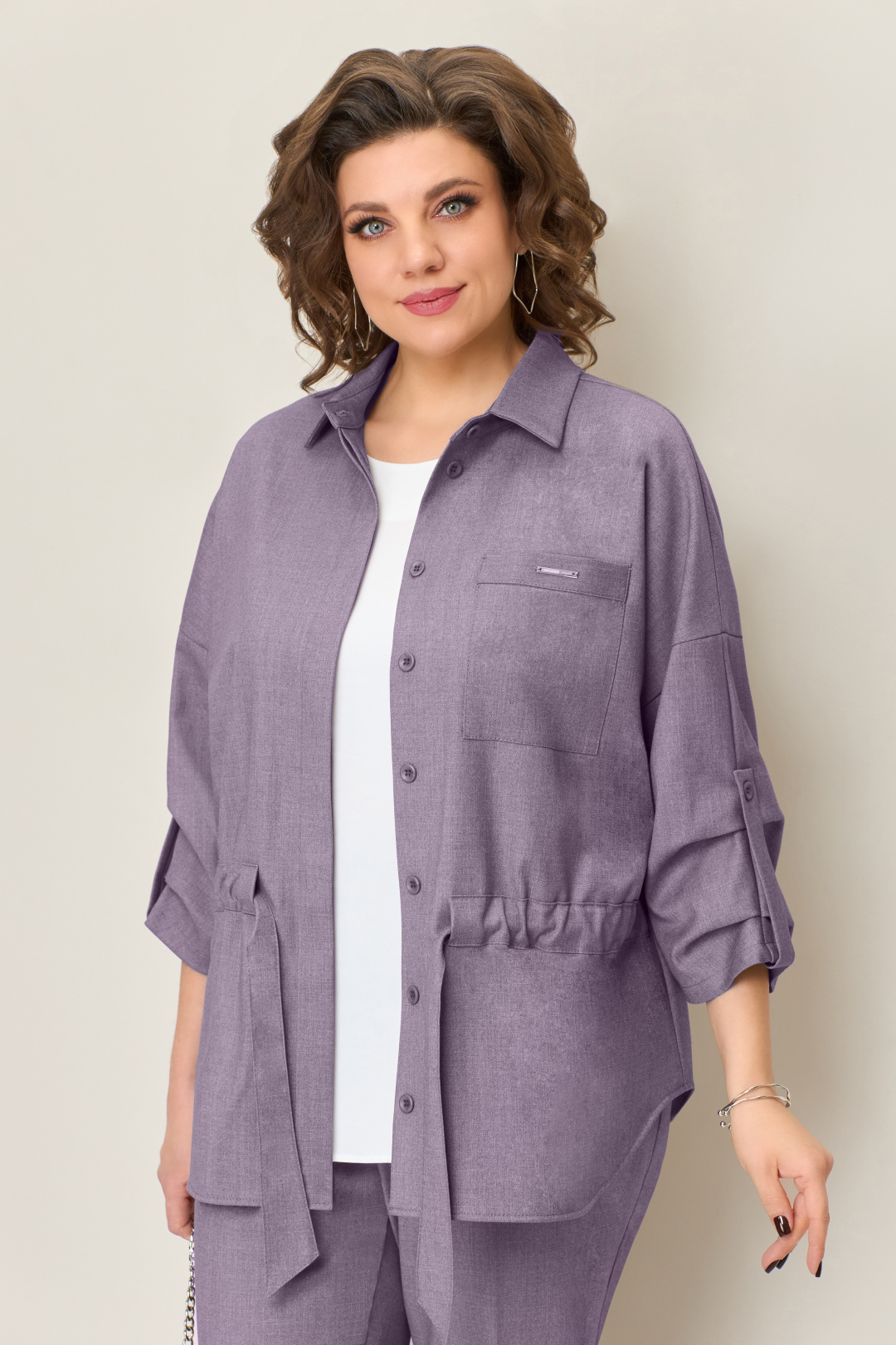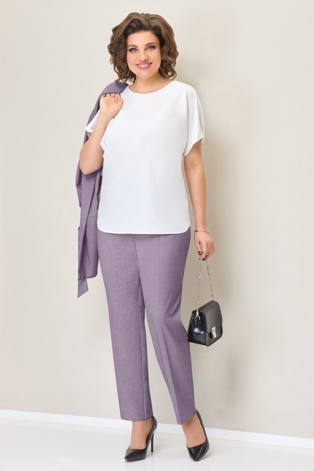 Костюм женский: жакет, брюки, блуза. Жакет на потайной застежке, с пришивной кулисой и поясом, прямые классические брюки и блуза- универсальный комплект для различных вариантов носки. Длина жакета по центру спинки- 67см. Элегантный рукав с патой на цельнокроеной основе. Брюки прямые с высокой посадкой, с притачным поясом на резинке. Длина брюк по боковому шву- 102см. Блуза из легкого текстиля с принтом, со спущенным коротким рукавом. Длина блузы по центру спинки- 62см.