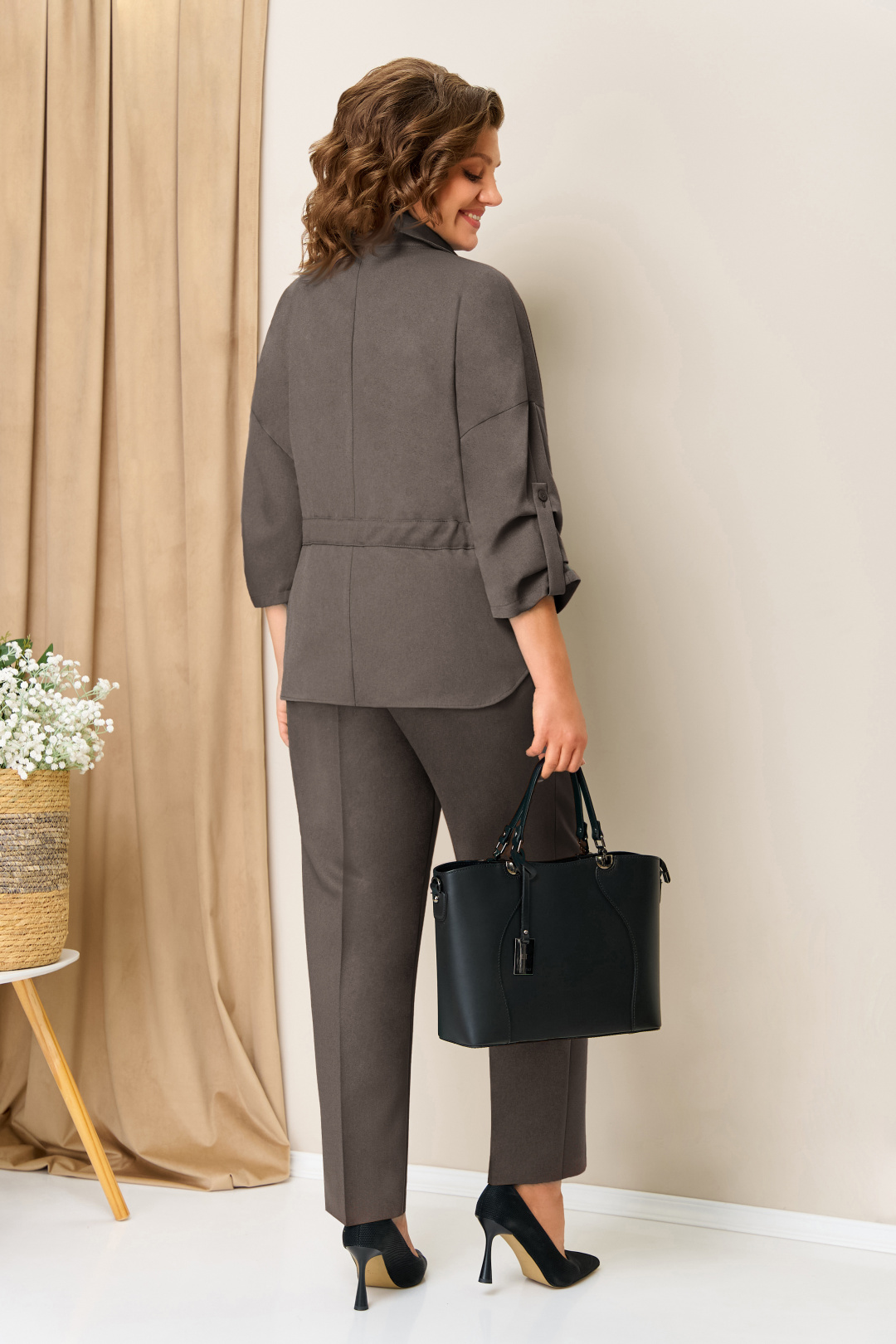 Костюм женский: жакет, брюки, блуза. Жакет на потайной застежке, с пришивной кулисой и поясом, прямые классические брюки и блуза- универсальный комплект для различных вариантов носки. Длина жакета по центру спинки- 67см. Элегантный рукав с патой на цельнокроеной основе. Брюки прямые с высокой посадкой, с притачным поясом на резинке. Длина брюк по боковому шву- 102см. Блуза из легкого текстиля с принтом, со спущенным коротким рукавом. Длина блузы по центру спинки- 62см.