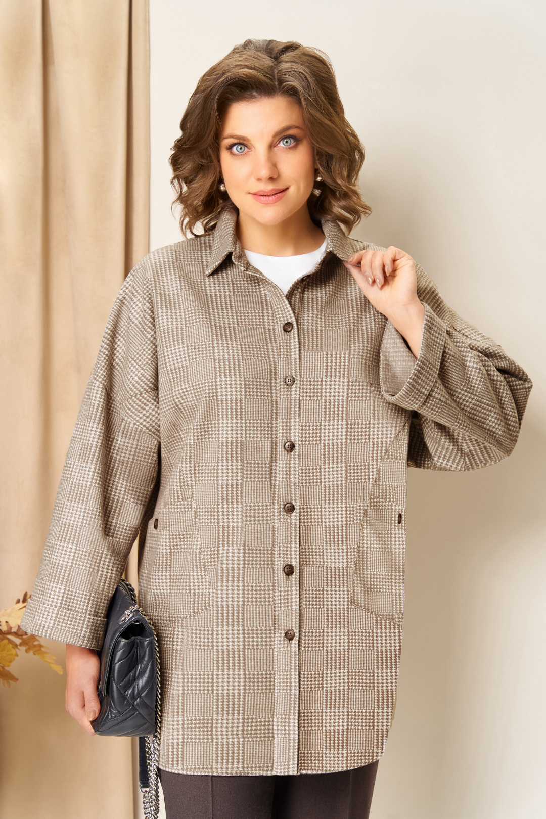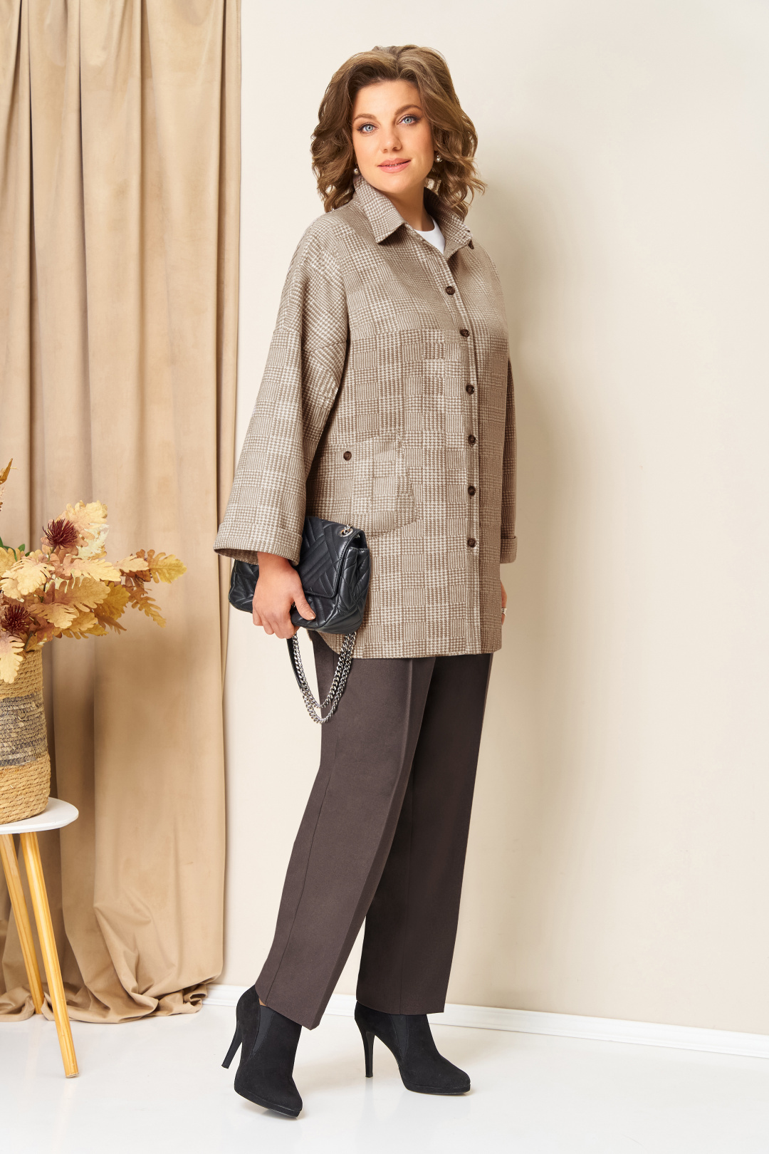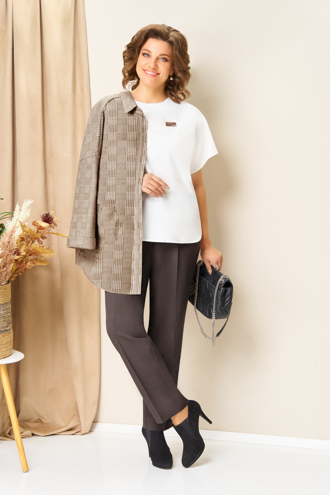 Универсальный комплект- тройка . Жакет-рубашка из утепленного текстиля на трикотажной основе, с цельнокроеным рукавом и застежкой на пуговицы.Длина жакета по центру спинки- 72см. Брюки прямые с высокой посадкой, с притачным поясом на резинке. Длина брюк по боковому шву- 101 см. Блуза со спущенным коротким рукавом . Длина блузы по спинке- 63 см .Блуза: полиэстер 95%, эластан 5%.