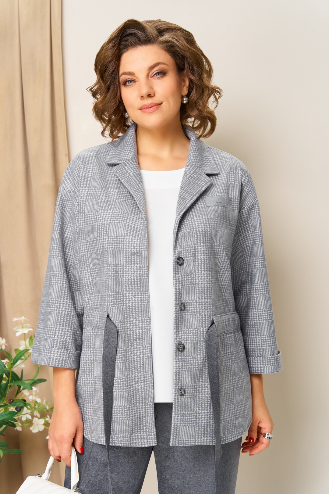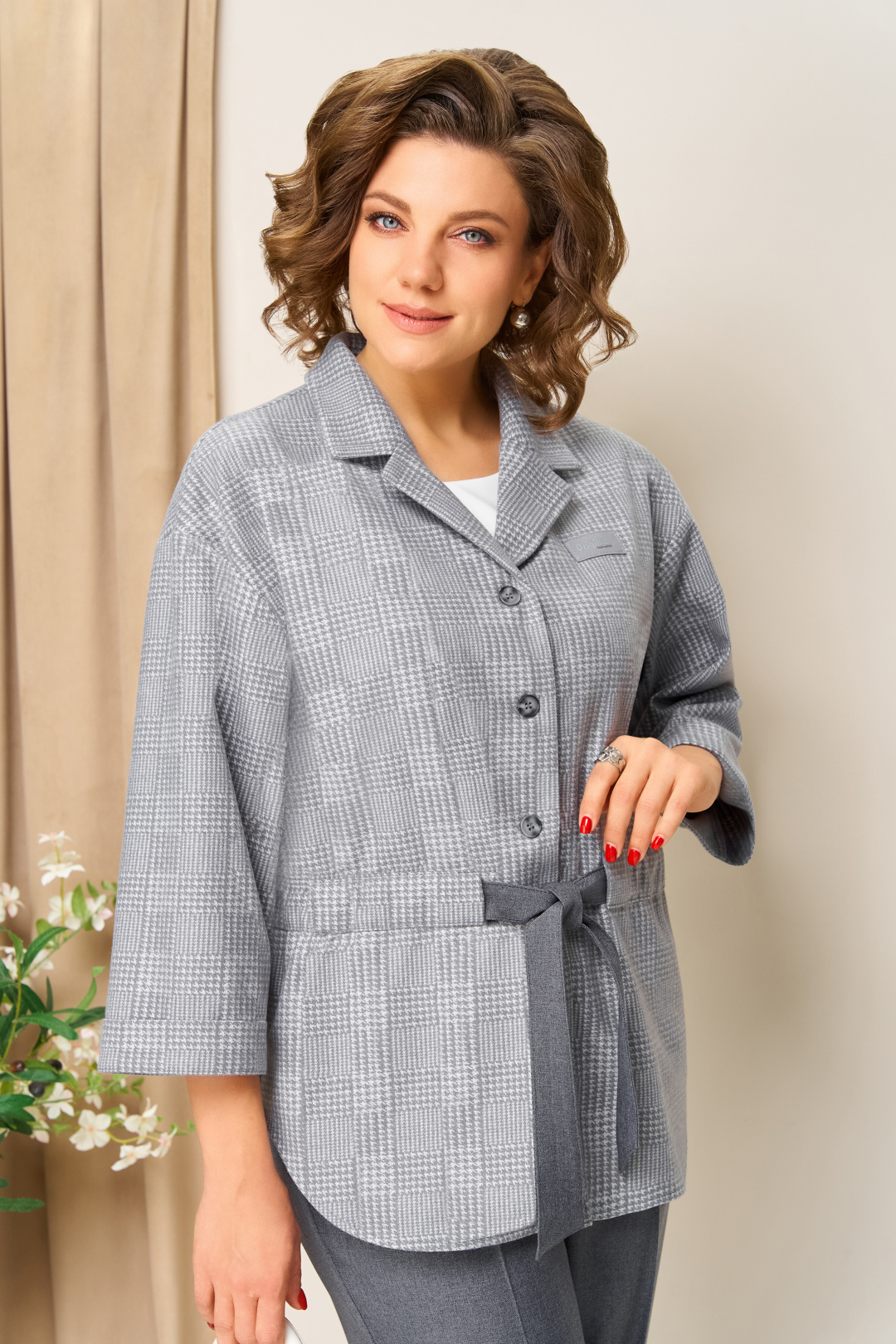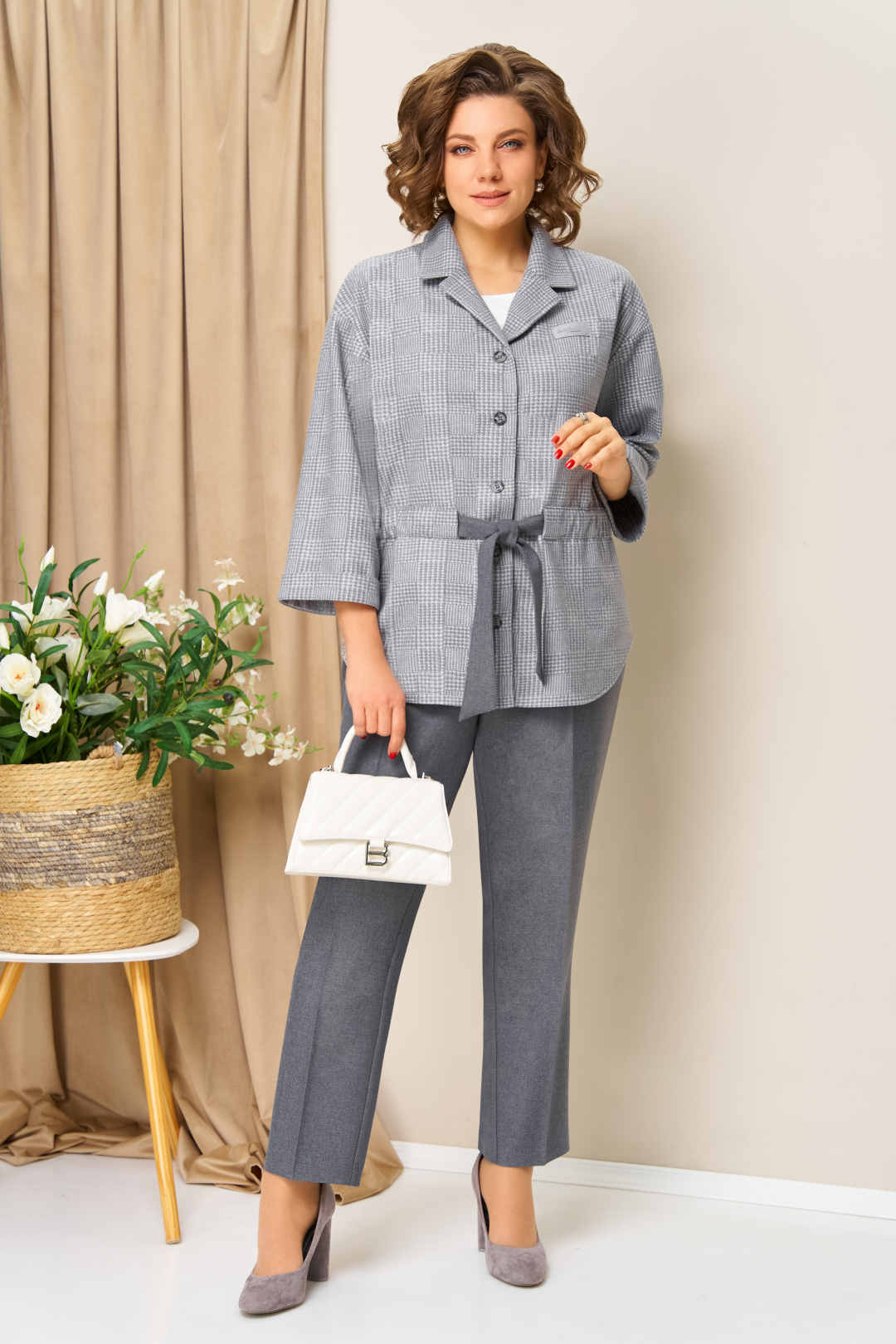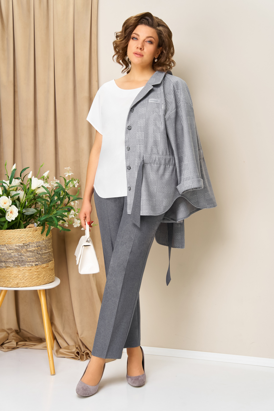 Костюм женский: жакет, брюки, блуза. Жакет с застежкой на пуговицы, с пришивной кулисой и поясом, прямые классические брюки и блуза- универсальный комплект для различных вариантов носки. Длина жакета по центру спинки- 71см. Элегантный рукав с отложной манжетой на цельнокроеной основе. Брюки прямые с высокой посадкой, с притачным поясом на резинке. Длина брюк по боковому шву- 102см. Блуза из легкого текстиля с принтом, со спущенным коротким рукавом. Длина блузы по центру спинки- 62см. Блуза: полиэстер 95%, эластан 5%.