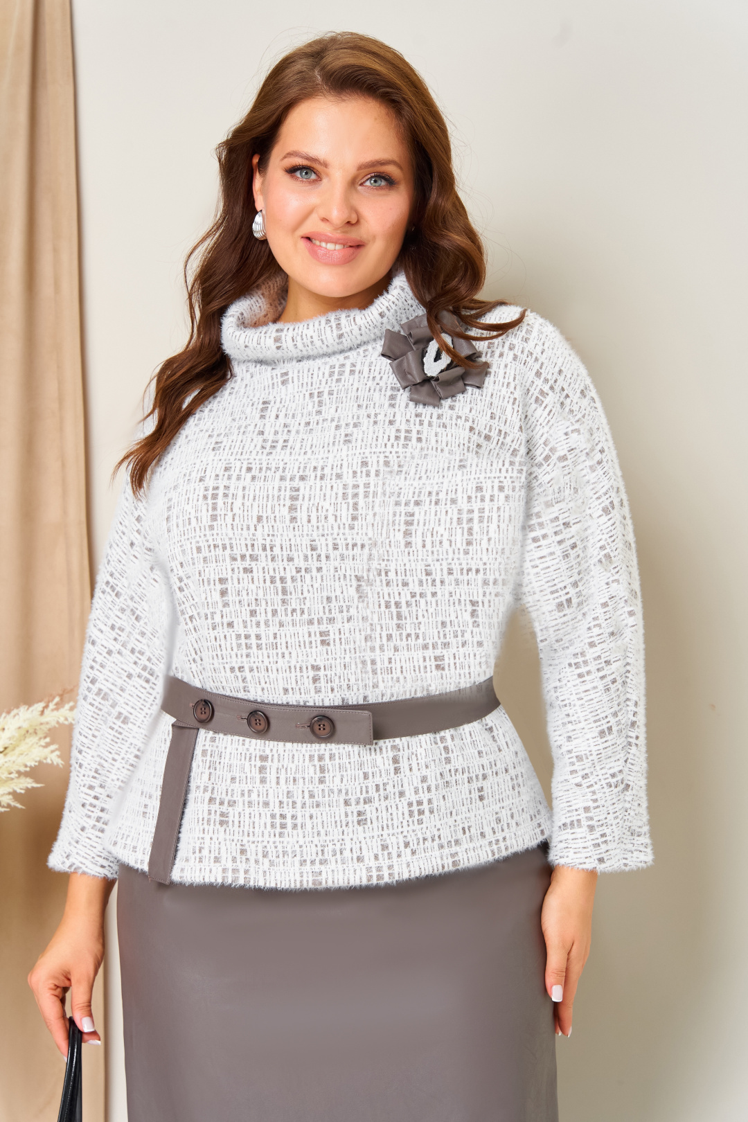 Изысканный комплект из трикотажного джемпера и юбки из искуственной кожи. Уютный джемпер с цельнокроеным рукавом и горловиной мягкая стойка. Длина джемпера по центру спинки- 59см. Удлиненная юбка прямого силуэта с разрезами по бокамс застежкой на пуговицы. Для удобства в поясе юбки вставки с резинками. Длина юбки - 87см. В комплекте изделия- съемная брошь из кожи в форме цветкка и пояс с застежкой на пуговицы.