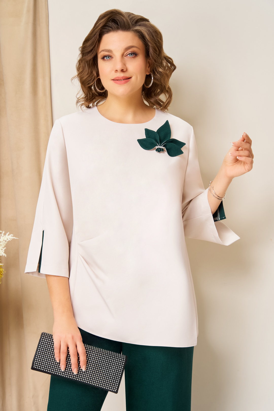 Костюм женский: жилет, брюки, блуза. Динамичный комплект-тройка: ассиметричный жилет на поясе, комфортная блуза с разрезом и брюки свободного кроя. Центральный элемент образа- оригинальный жилет слегка приталенного силуэта. изнутри жилет на круговой подкладке. Съемная брошь-лилия делает комплект еще более нарядным, при этом создает различные варианты для носки. Длина жилета от плеча до выступающей нижней части-71см.Брюки прямые с высокой посадкой, с притачным поясом со вставками с резинкой. Длина брюк по боковому шву- 102см. Блуза из легкого текстиля с легкими складками с одной стороны и разрезом с другой.Длина блузы по центру спинки- 63см. Рукава блузы втачные, книзу со шлицами, длина рукава-45 см.