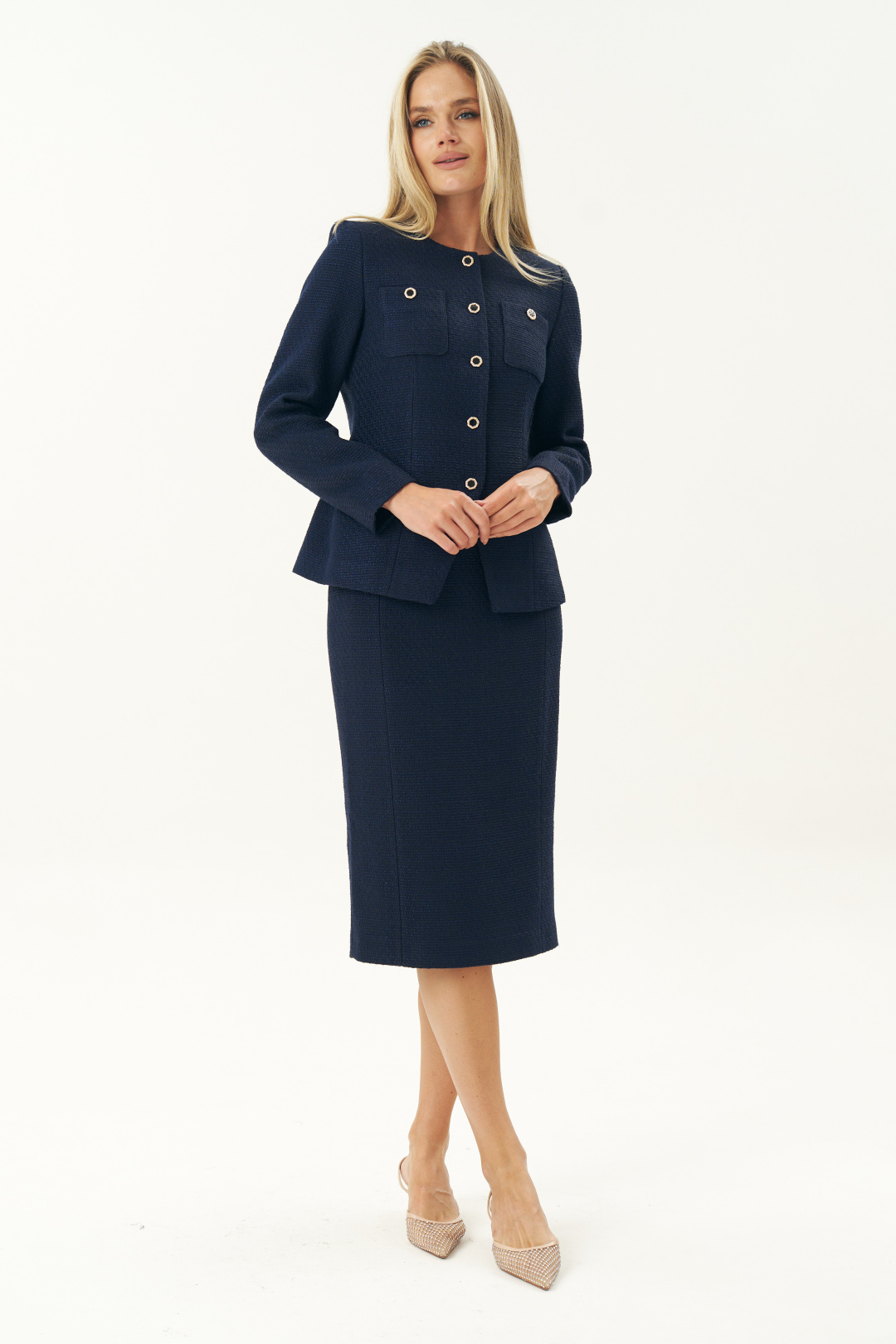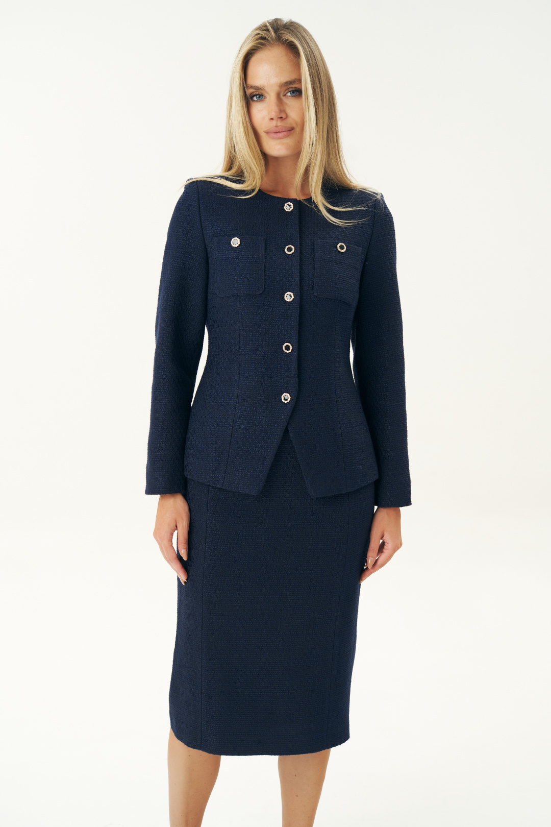 Элегантный синий твидовый костюм женский с юбкой от бренда URS создан для тех, кто ценит безупречный стиль, утонченную классику и современный деловой образ. Эта модель воплощает лучшие традиции женской одежды из твида, сохраняя узнаваемую эстетику твидовых костюмов, вдохновленных стилем Chanel, и при этом полностью соответствует требованиям современной моды, дресс-кода и офисного этикета. Костюм женский 2-х предметный, состоящий из жакета и юбки, из костюмной ткани рогожка. Костюм может быть как нарядный, так и для повседневной носки.