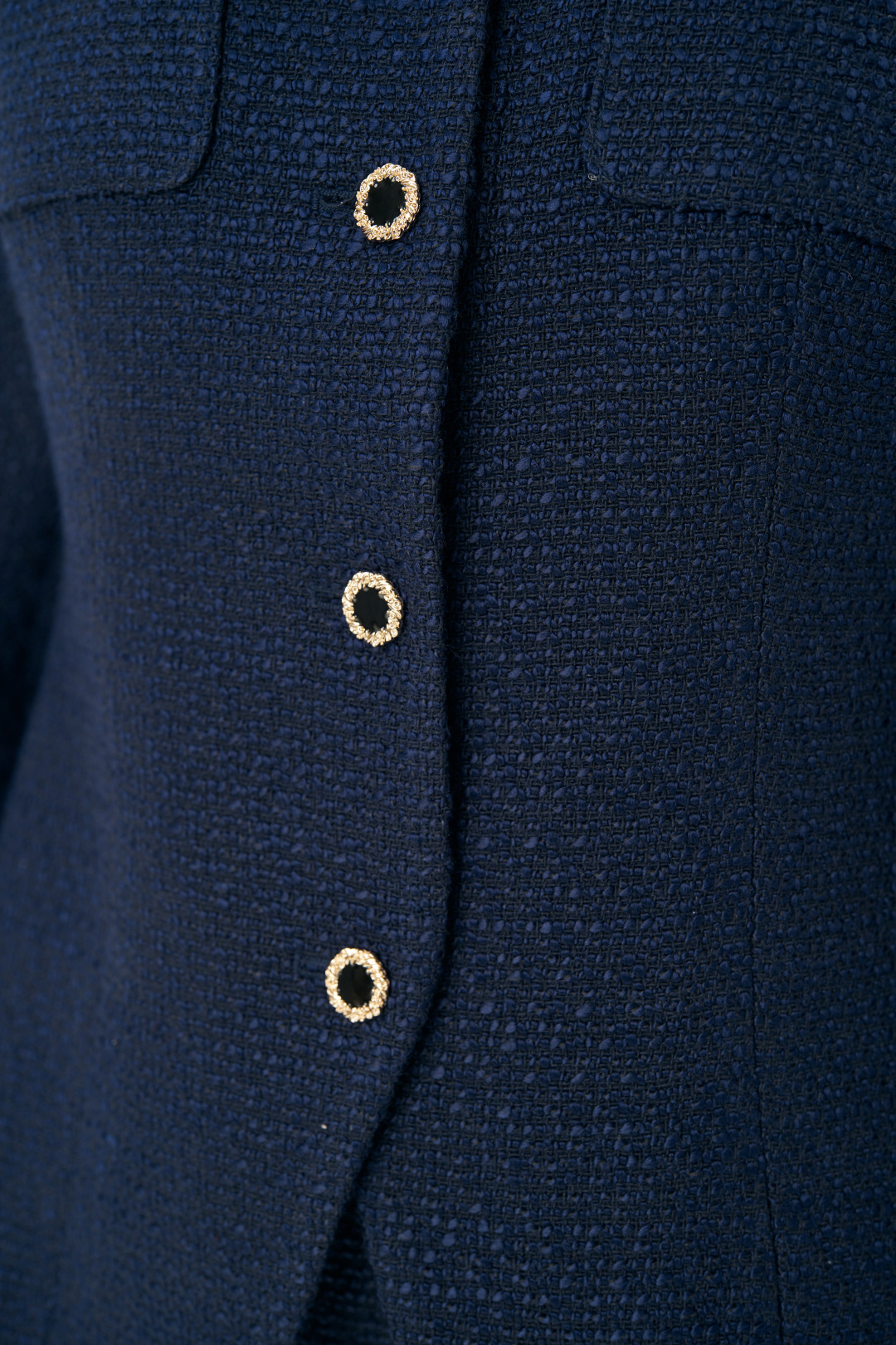 Жакет полуприлегающего силуэта, на подкладке, с центральной бортовой застежкой до верха на 5 петель и 5 декоративных пуговиц (размер и цвет фурнитуры может незначительно отличаться от фото) с фигурными к низу бортами.
