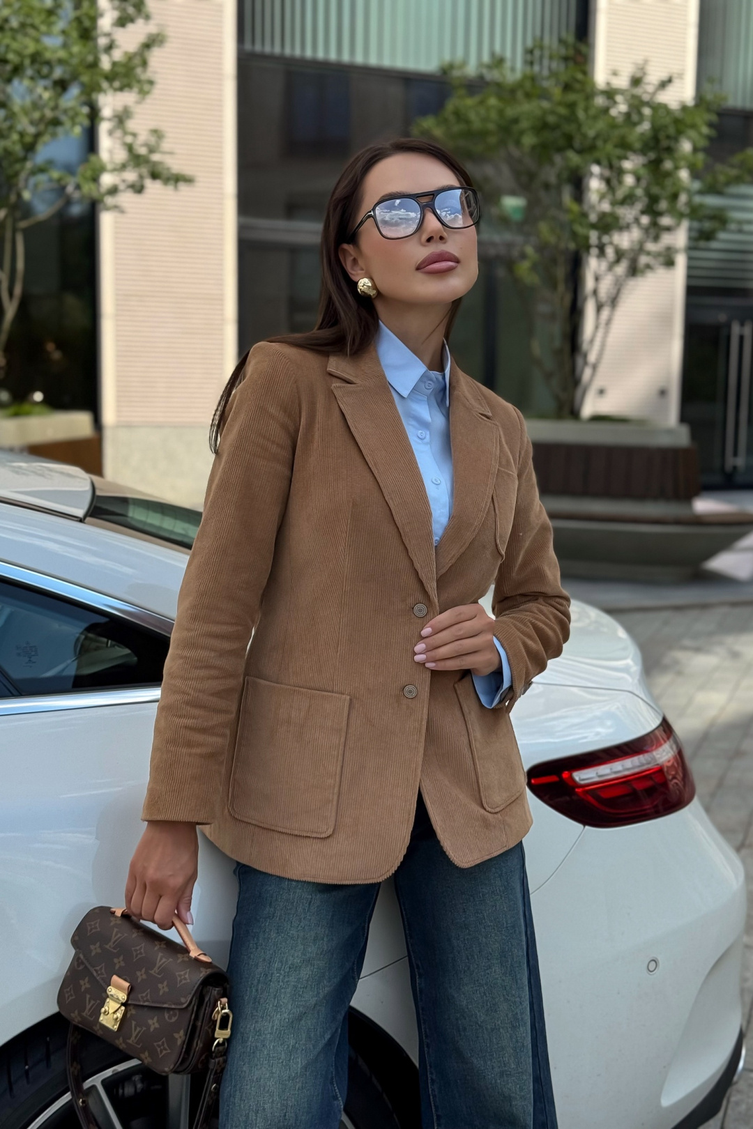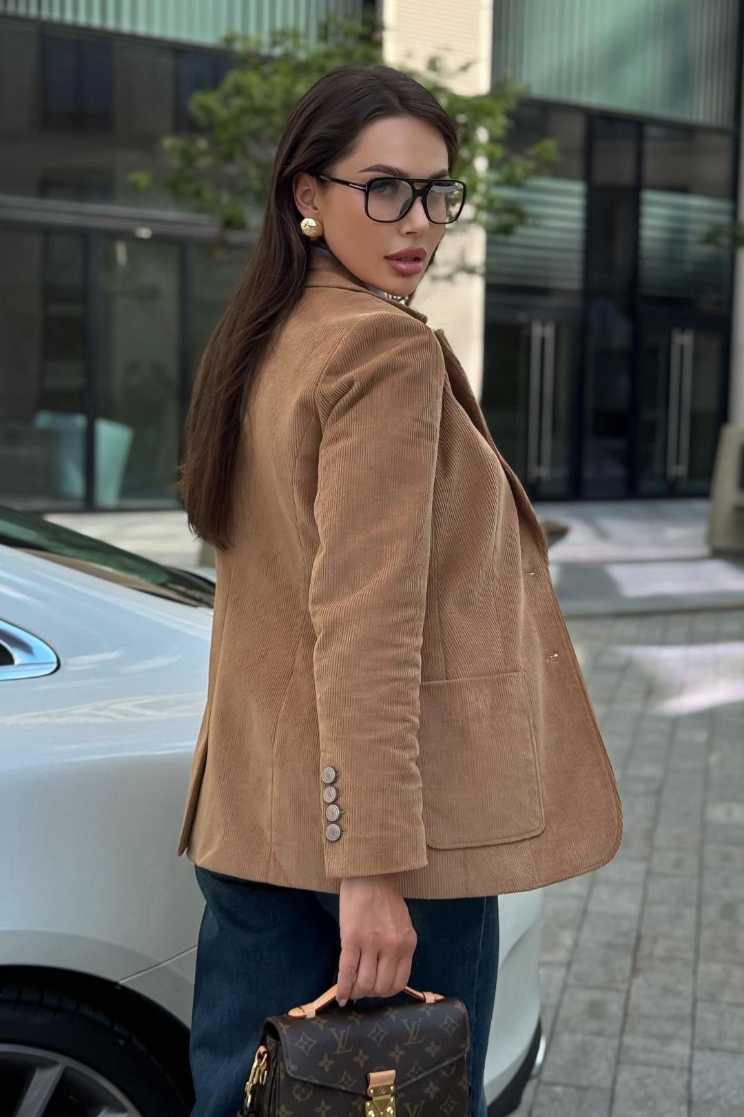 Жакет женский вельветовый коричневый URS — это сочетание элегантного стиля и практичности. Классический приталенный крой, лацканы и застёжка на пуговицы делают его универсальным вариантом для офиса, прогулок и городских встреч. Жакет женский полуприлегающего силуэта, выполнен из костюмной вельветовой ткани, на подкладке, с воротником пиджачного типа, предназначен для повседневной носки. Перед жакета с центральной бортовой застежкой на 2 петли и 2 пуговицы (фурнитура может незначительно отличаться от фото), с закругленными по низу бортами. Перед с полурельефами и с вертикальными рельефными швами. Нижние части переда и верхняя левая часть переда с накладными карманами закругленной формы. Спинка с рельефными швами, со средним швом в нижней части со шлицей.