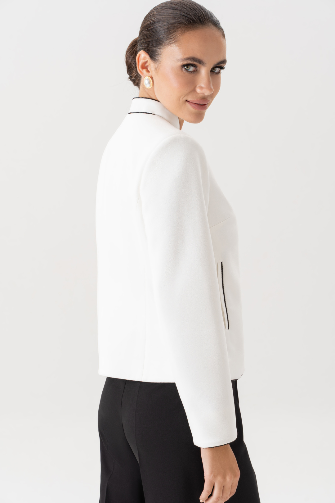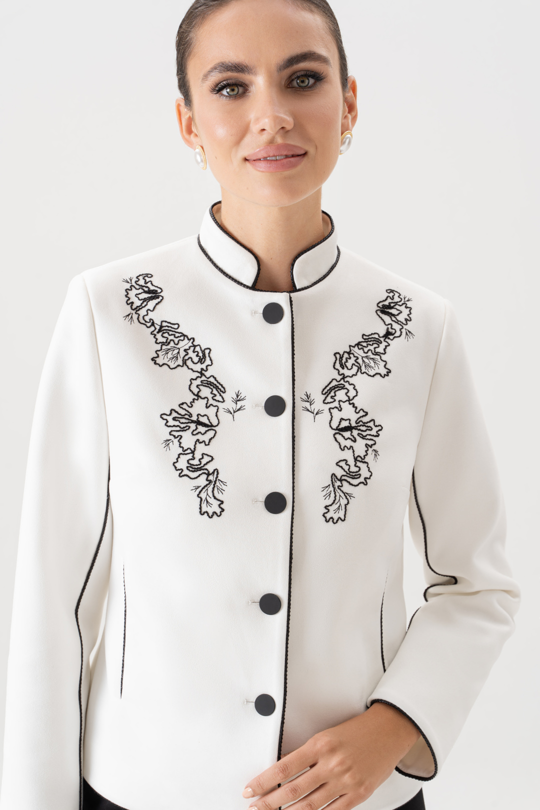 Жакет с центральной бортовой застежкой на 5 петель и пуговиц (фурнитура может незначительно отличаться от фото). По верху жакета выполнена вышивка. Перед с нагрудными вытачками, выходящими из бокового шва и вертикальными карманами с листочкой с отделкой кантом.
